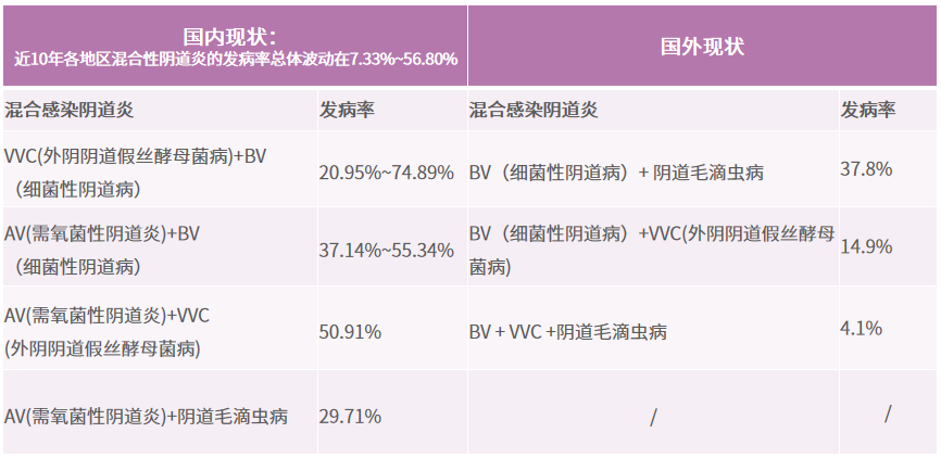 《混合性阴道炎诊治专家共识(2021 版)》提出:近 10 年来我国混合性阴道炎的发病率总体波动为 7.33%-56.80%。女性外阴、阴道及宫颈相关病原体的混合感染也需要关注。