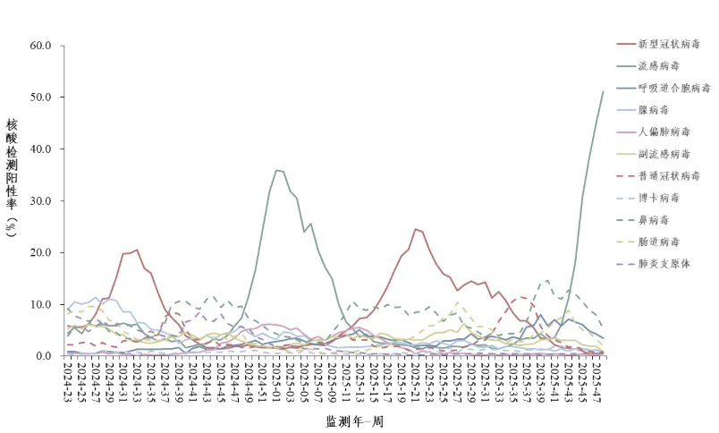 图 3. 哨点医院门急诊流感样病例呼吸道样本病原体核酸检测阳性率每周变化趋势