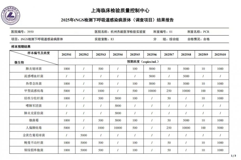 近日,上海市临床检验质量控制中心公布了 2025 年度下呼吸道感染病原体 tNGS(靶向二代测序)检测室间质量评价结果。经过严格评审,杭州杰毅医学检验实验室在本次室间质评中高分通过,检测能力再获权威认可!